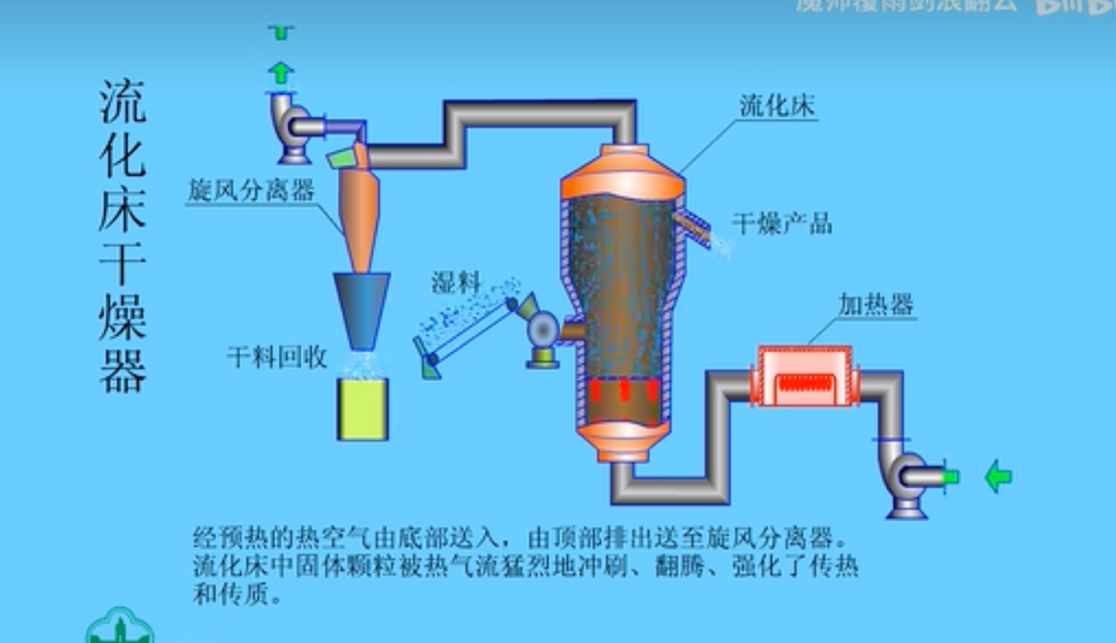 湿物料干燥:湿物料在流化床中与热空气接触,湿分被热空气带走,物料逐渐干燥。